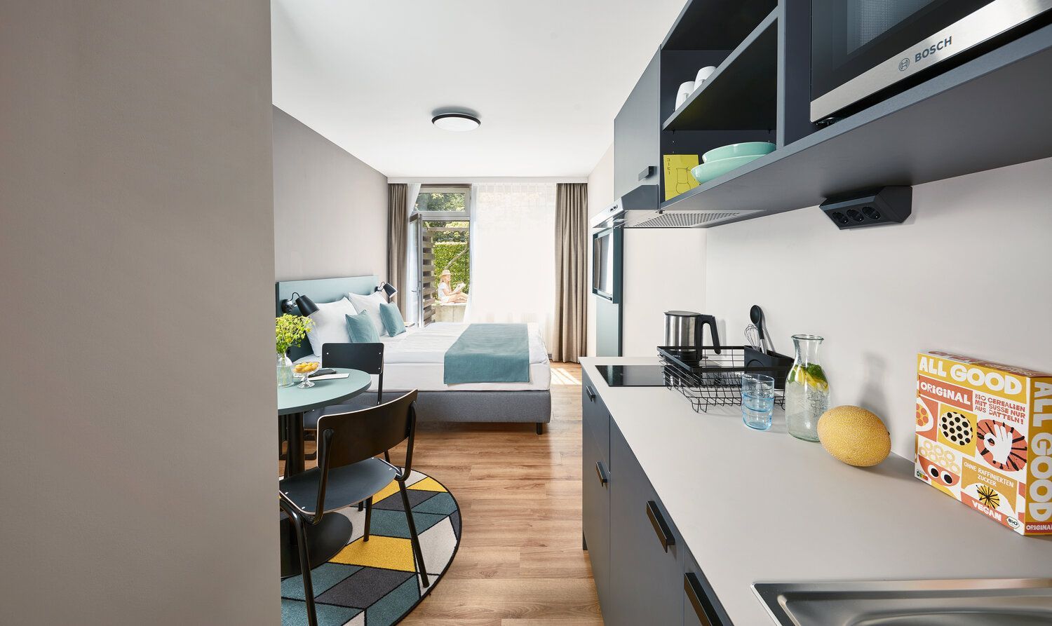 Die Apartments und Business-Zimmer ab ca. 23 m² sind mit voll ausgestatteter Kitchenette, Highspeed-WLAN und großzügigen Arbeitsbereichen versehen. Einige Einheiten verfügen über Balkone oder Terrassen, die das Wohnerlebnis zusätzlich auflockern.